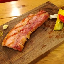 西天満「サルベーコン」の『炙りベーコン500円』。 分厚い自家製ベーコンがビールに合う合う♪