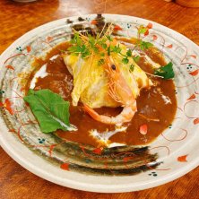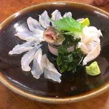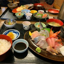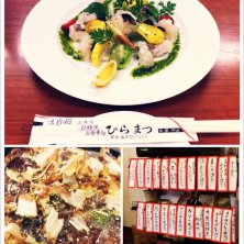 漁港近くの美味しい食堂! ハモの炙りカルパッチョに魚介たっぷりのミックス焼(^_^) おビールがいただきたい。 予約をオススメします。
