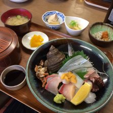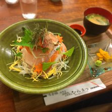 淡路島は福良にある、ひらまつ食堂にてサクラマス、かんぱち、サワラたたきからなる三色海鮮丼をいただきました。