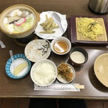 お昼ご飯 鱈の塩鍋 阿寒湖名物 公魚の天婦羅 ざるラーメン 胡麻ダレ 松前漬け お腹いっぱい 御馳走でした(о´∀`о)