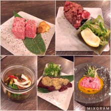 今夜のごはん♡ 久々に電車で京都♡ 焼肉屋さんでご飯食べてきました〜♡ 京都市内に何店舗かあるお店です。 今日の初めては、タンのマンゴーカット!笑 かなり分厚目に切ったタン。(左上pic...ちと雑w) 焼いてからハサミでチョキチョキします。 同じ器にはハラミとツラミ。これも美味しい♡ そのほかは、枝豆キムチ、ナムル盛り合わせ、 特選ユッケ、センマイ、壺漬けのハラミにホルモン、特大ロース、ミノも柔らかくてとっても美味しかった〜♡ 解除後初の外食。17時スタートで良かった…♡