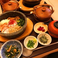 東京グルメ探訪!新宿区、新宿三丁目編 名物、水炊きスープ出汁の親子丼! 老舗、水炊き専門店のリーズナブルな食堂 人気名店「げんかい食堂」初訪問! 迷わず、名物、親子丼!と思いきや隣を見ると! あつあつ鶏飯、多種な具材に真ん中には半熟卵! 美味しそなビジュアルに水炊きスープ掛けると! 迷った挙句、また来れば良し、あつあつ鶏飯に! 待つ事10分程、熱々ジュージューと土鍋が登場! お盆の上には、水炊きスープ、薬味、お味噌汁! デザートはわらび餅きな粉のせ、別にサラダが!