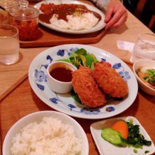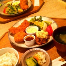 お昼ゴハン。 お魚のフライ チキン南蛮 コロッケ ハ穀米 お味噌汁 おつけもの 揚げ物いっぱい、今日は晩ゴハンいらんっ(`へ´*)ノ とか言うけどやっぱり食べるっちゃんね、結局。