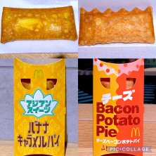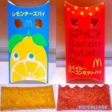 ファストフードのチェーン店、マクドナルドで購入した過去と現在の期間限定メニューのパイ。 中身は、 ・左側→レモンチーズパイ。 ・下段→スパイシーベーコンポテトパイ。 レモンチーズパイは普通でしたが、スパイシーベーコンポテトパイはベーコンポテトパイに辛味が加わって美味しかったです。仕事帰りのおやつ用に試しに購入して食べてみました。