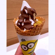 ファストフードのチェーン店、マクドナルドの期間限定のソフトクリーム、ワッフルコーン チョコバナナ。 チョコレートソースと果肉が入った甘いバナナソースがトッピングされたソフトクリームです。 マクドナルドのホームページはこちら。 https://www.mcdonalds.co.jp