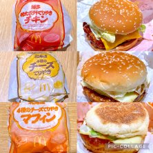 ファストフードのチェーン店、マクドナルドの期間限定メニューのご当地てりやきJAPANシリーズのハンバーガー類。1つだけは入れていない。 上から順に ・上段→ 博多明太ポテトてりやきチキン。 ・中段→北海道4種のチーズてりやき。 ・下段→北海道4種のチーズてりやきマフィン。 あと1品、瀬戸内レモンペッパーたまごてりやきが有るが、卵が苦手な為食べなかった。味はどれも普通やったかな。普通のてりやきバーガーで十分な気がする。マフィンは朝マック時間帯の限定販売。