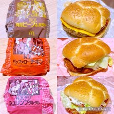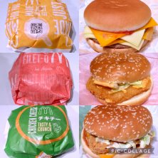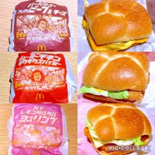 ファストフードのチェーン店、マクドナルドの期間限定メニュー、N.Y.バーガーズシリーズのハンバーガー類。 上から順に ・上段→N.Y.バーベキュー肉厚ビーフ&チーズ。 ・中段→N.Y.ジューシーチキンザクザクスパイシー。 ・下段→N.Y.レモンタルタルシュリンプ。 どれも美味かったが、肉厚ビーフが1番かな。ただ、肉厚と名前が付く割にはビーフが肉厚ではないと感じた。シュリンプはエビフィレオと余り変わらない。