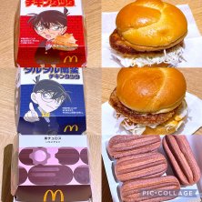 ファストフードのチェーン店、マクドナルドの期間限定メニューのハンバーガーとサイドメニュー。 上から順に ・上段→ チキンタツタ。 ・中段→タルタル南蛮チキンタツタ。 ・下段→ひとくち黒チュロス いちごチョコ。 お待ちかねのチキンタツタが帰って来た。今回は普通のに加え、新たにタルタル南蛮が登場。チキンタツタ好きで出る度に毎回買っているが、やはりノーマルのが1番美味い。チュロスは甘味は有る物の、サクサク感が微妙。