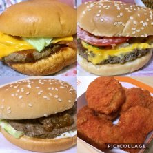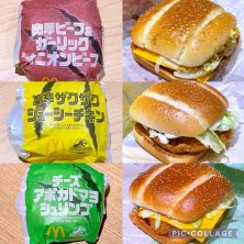 ファストフードのチェーン店、マクドナルドの期間限定メニューのジュラシック・ワールドバーガーズのハンバーガー類。 上から順に ・上段→ 肉厚ビーフ&ガーリックオニオンビーフ。 ・中段→旨辛サクサクジューシーチキン。 ・下段→チーズアボカドマヨシュリンプ。 どれも美味かったが、自分としてはジューシーチキンが1番好きかな。肉厚ビーフは特に肉厚やという実感が無かった。