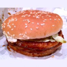 ファストフードのチェーン店、マクドナルドのアツ!てりやき(倍てりやきマックバーガー)。 通常のてりやきバーガーに、ポークパティをもう1枚乗せたハンバーガーです。 現在、ブアツく生きよう 第3弾として発売されているハンバーガーで、日中の時間帯は期間限定メニューとして出されていますが、いつもの17時から発売される夜マック(通常のバーガー類に、別途100円を追加して、パティをもう1枚追加して貰う事)の時間帯でも食べられます。