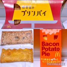 ファストフードのチェーン店、マクドナルドで購入した期間限定メニューのパイ。 中身は、 ・上段→喫茶店のプリンパイ。 ・下段→ベーコンポテトパイ。 です。プリンパイはカスタードとカラメルの甘味が、ベーコンポテトパイは中にベーコンとポテトのホクホクさが有ってどちらも美味しかったです。自分はベーコンポテトパイが好きなので、これが出たら毎回食べます。