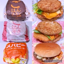 ファストフードのチェーン店、マクドナルドの過去の期間限定メニューとレギュラーメニュー。下段のスパビーはレギュラーメニューです。 中身は、 ・上段→ごはんチキン にんにく黒胡椒。 ・中段→ごはん海老 旨辛仕立て。 ・下段→スパビー(スパイシービーフバーガー)。 です。 マクドナルドのホームページはこちら。 https://www.mcdonalds.co.jp