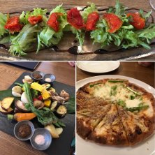・セミドライトマトのスモーク ・薪窯焼 野菜の盛り合わせ ・ピザハーフ&ハーフ アスパラ アンチョビソース 2種のチーズ みょうが 味噌ソース ごま パルミジャーノ お野菜のおいしいお店(๑˃̵ᴗ˂̵)薪窯焼のお野菜は甘くてジューシィで美味しかったです(๑´ڡ`๑) 季節のお野菜がピザでいただけます^ ^気になったみょうが!味噌ソースとチーズと合うし、火の通り加減が絶妙(*´艸`*)