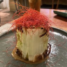 白菜の窯蒸焼き。白菜の間に柚子が入っていて、食べるとふわっと柚子の香りがして美味しい。下に味噌田楽の味噌と柚子味噌があり、付けて食べます。すごくシンプルだけどなかなか出せない味。★★★★★