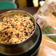 ローストアーモンドフラペチーノをキャラメルシロップ、キャラメルソース、チョコチップ追加、ブラべミルクで♡ 背後にはコブサラダとバルサミコチキン♡今度のピタはどちらもハマりました♡