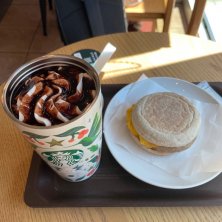 ソーセージチーズマフィン スマトラホワイトモカシロップホイップチョコレートソース