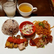 本日のランチ ビストロランチプレート B🐔🐷 1000円 鶏のガーリックハーブグリル&トンテキ&ナポリタン&コールスロー ドリンク🍹☕️&スープはFree!!😄👍 🍚は白米か十五穀米か選べます りんご酢白桃ミックスをチョイス♡ 見た目より量があります👌
