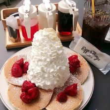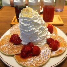 今日のおやつ。 エッグスン シングスのパンケーキ!! とうとう食べてしまった…! あまりにも凄そうな生クリームを見ると、食べなくてもいいと思っていたけど、彼に誘われたら、ちょっと冒険してみたくなりました(*-∀-*)ゞエヘヘ 生クリームは思ったよりも全然あまくなくて、パクパクいっちゃう感じです。 ソースは3種類でグアバ、ココナッツ、メープル。 ソースさえかけ過ぎなければ(→勢いよくかけ過ぎたヒト( ̄▽ ̄))、食べれちゃう美味しさでした❤︎