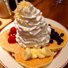 銀座店一周年記念Anniversary《Ekahi(エカヒ)パンケーキ》 香り高いビターチョコレートをグラサージュ!添えてあるフルーツはラムレーズン、キャラメルリンゴ、ラズベリーにホイップクリームが多すぎで驚いたよ!!(゜ロ゜ノ)ノ 今月いっぱい迄の限定!! ※来月中旬ぐらいにラゾーナ川崎にエッグスンシングスがオープン♪