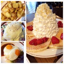 銀座のエッグスンシングスに行ってきた(^^) ポテト、エッグベネティクト、ロコモコ、&パンケーキ。パンケーキのホイップはこれでも少なめ(笑)でも全然甘くないの!!ホイップまで完食できたよ(^^)