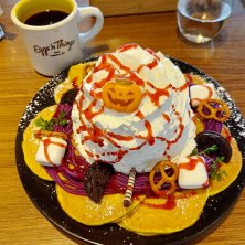 ハッピーハロウィーンパンケーキ🎃 このトッピングのプレッツェルがしょっぱくて、甘いのと交互にいけてしまう❗ いつも半分くらいで一旦休憩するのに半分以上ノンストップでいけてしまった。 恐ろしい😱 いろんな味がしておいしかったー😋