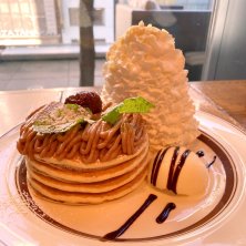 そしてママは月1恒例の隣の幼稚園ママ友とのエッグスンシングスでのブランチ❤️✨ 毎月LINEで新メニュー送られてくるから行こうかってなる😊 今月は🌰モンブランパンケーキ🥞❤️✨ すごーい栗の甘い香りがしたよ💕めっちゃ甘かったけどw美味しかった〜💕