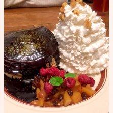 銀座店 1周年限定のエカヒパンケーキ パンケーキにはビターな金粉のかかったチョコレート パンケーキの中やホイップのトッピングにくるみ、ラズベリーやキャラメリゼしたリンゴ、ラムレーズンがいっぱい(≧∇≦) 贅沢なパンケーキです(*^^*)