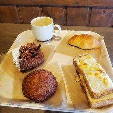 ベリーのデニッシュ、イカスミ明太子パン、塩パンのチョコとバターサンドです🥖 ベリーのデニッシュはサクサク生地で、クリームチーズの上にブルーベリー、ラズベリーが合う~ 塩パンはナッツ入りの板チョコとバターがサンドしてあります🍫