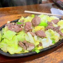 機関車級の煙を出しながら、運ばれてきます。 メニューはコレのみ。盛り加減を注文します。 ジャルンは鉄板焼きなのでしょうが、メニューはコレしかないので、どうなんだろう?