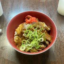 ソースかつ丼。薄切り肉を串にくるくる巻いて揚げてます。
