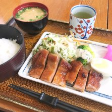 ハンバーグ定食(デミグラスソース) 山から降りてお腹ぺこぺこで 早めの晩ご飯。 元々は和菓子屋さんのお店みたいだけど 定食もスパゲティもケーキもお酒もあって めっちゃメニュー数が多い。