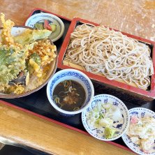 ローストポーク丼と蕎麦セット 1200円(平日ランチタイムは850円だそうです) 豚肉を真空低温調理技法でローストポークをつくり生野菜、卵黄盛り付け、仕上げにマスタード入りオニオンソースをかけた逸品と新蕎麦のセット 長野市九反信号 手打ち蕎麦処そば忠本店