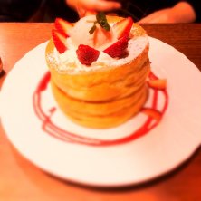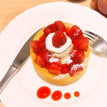 春のストロベリーフェア 苺たっぷりスフレパンケーキ🍓(シングル)&フルーツティー ふわっふわなパンケーキに苺が沢山乗った今の時期限定販売のパンケーキ 大変美味しく頂きました(^^)♪