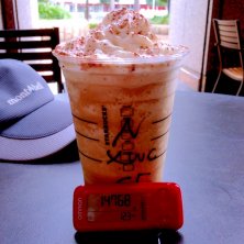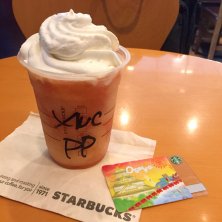 リワードチケットがたくさんたまってるので、 ダンナちゃんと一緒にストロベリーフラペを🍓 アーモンドミルクにカスタムしたついでに、 私はノンホイップに。ついでにチョコチッププラス。美味しくカスタマイズできたわ。