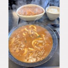 カツカレーうどん定食 とりあえず量がヤバい。 お腹いっぱいなったよ! トロトロにとろみのついたカレーと極太もちもちうどんというコンビは強いね。 最初の方はすすってもすすれない! 強引にいこうとしたら舌火傷した。 ここの麺は2本程度をお箸で持ち上げて、しっかりふーふーしてからそっと口に運ばなあきません。