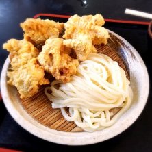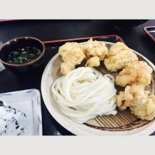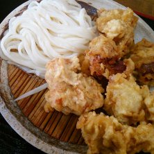 讃岐うどんツアー1軒目「うわさの麺蔵」 前回はとり天ざるで終盤に響いたので、今日はざる小(¥270)にして他のメンバーにとり天イカ天1個ずつもらってちょうどいい感じ! 1軒目からとり天2玉いったヤツも・・・