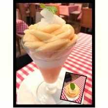 本日早帰り🚃 遅めのランチをとオムライスを食べに行くも🈵💦 あ❤️ 美味しい桃パフェチャンス🍑✨ ⌘清水白桃パフェ 私の✊より大きな桃ーーー🤩‼️ 🍑グラニテ、ジャム、コンポート、ゼリーにジュレ🍑 アクセントのバニラアイスとヨーグルトムース😍 アンテナショップで販売してた桃の価格を考えると このパフェ激安なんじゃなかろうか⁉️