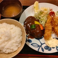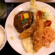 今日は雨だし幼稚園午前授業だし家でゆっくりした☔️☔☔〜そしてお迎えのあとは電車で幼児教室へ〜🚃 次自転車🚲乗れないとまぁ不便で!雨の中荷物も多いしびしょ濡れで疲れ果てた😓 気になってた洋食屋さん😊 ☆ハンバーグ&海老フライ☆¥1.300