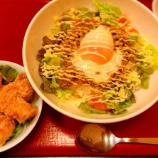 唐揚げとタコライス定食 異色の組み合わせだがこのお店は唐揚げが推しらしい 唐揚げおかわり自由定食ってのもあって隣の若者が頼んでた 隣の人、すぐに一回目のおかわりで5個追加 その後またすぐに追加しようとしたら「ラストオーダーです、何個追加しますか?」と言われ「え?ラストオーダーあんの?」と聞き直してたw そうだよね、全然自由じゃないよね ただ14:28だったからランチ営業の終了時間だね で、結局10個頼んでた トータル20唐揚げ 若いって素晴らしい