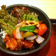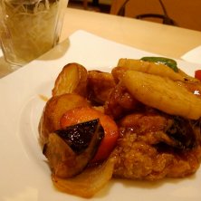 ミニ鶏と野菜の黒酢あん☆ なす・じゃがいもなんかも激ウマなんだけど、嫌いなニンジンがこんなに美味しいことがこのメニューはすごいと思う。レンコンは神の域。でも豚のが好きだった…