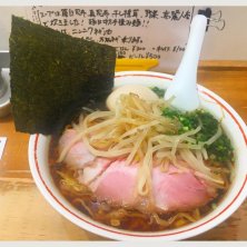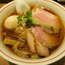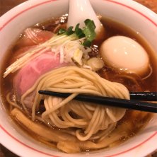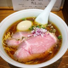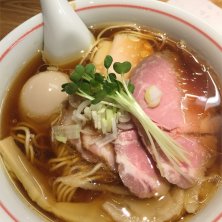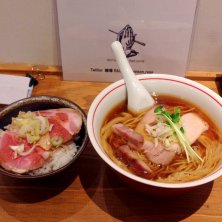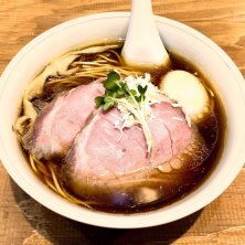 中華そば屋伊藤を出て、もう一杯ぐらい行けそうなので、ミル友さんオススメの店へ。 特製軍鶏そば。 澄んだ醤油味のスープはキリッとシャープな味わい。 さらに軍鶏出汁の旨味がじわりじわりと押し寄せて来ます。 尼崎のロックンビリーS1にも似た切れ味鋭いスープで、私の好みド真ん中‼ そんなスープにシャキッとしたストレート細麺は相性抜群‼ 更にチャーシューは豚バラ、真空低温調理の豚肩ロースに鶏チャーシュー。 私が大好きなな穂先メンマまで入っていました‼ いゃ~旨かった~♪ 再訪確実です‼