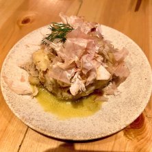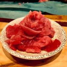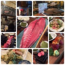 人気のマグロの店で夕食 マグロのワンダーランドだって。 本マグロのマグロマート盛り 赤身、中トロ、脳天、ほほ肉、アゴ の5種類 そのうちの2つは、焼いて そして、1つは、胡麻油で、食べる 本マグロの中落ちは骨ごとくるのを スプーンで削って食べます マグロの天ぷらはチーズ挟み大葉 で包んで揚げてサクッと サラダ お勧め三種巻きは マグロ、うに、イクラを和えたもの 酢飯と海苔 どれも美味しくてお酒が進みました♡