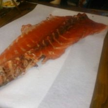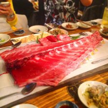 なんかシャケに見えるけど、マグロです。スプーンでホジホジするんですけど四人で食べきるのキツかった