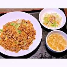 東京都と神奈川県に有る中華料理の店、健康中華 青蓮のランチメニュー、牛肉炒飯セット。牛肉炒飯、サラダとスープがセットになった定食。醤油の香ばしい味わいが堪らない。