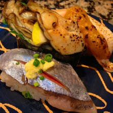 手前左から秋刀魚、サーモンちゃんちゃん焼、炙り牡蠣。秋の三貫盛。秋はやっぱり秋刀魚!