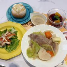 ランチを兼ねて料理教室へ🍳 ☆ごちそうポークポトフとポルチーニソース🫕 ☆プチくるみパン🥖 ☆きのこのマリネサラダ🥗 ☆サングリア風ゼリー🍷 東芝石窯ドームとのタイアップのレッスンで、オーブンでポトフとパンを同時調理するこ裏技を学びました👍✨ ポトフは別添えのポルチーニソースで味変させるとめっちゃ美味!! 家で復習するには高級食材のポルチーニを買わなアカンから悩ましいわ…😅 ちなみに本日の調理時間は1時間程度!! 但し4人がかりだったので、ワンオペやと2時間はかかるかな?