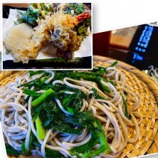 にらそば 旬の野菜天とエビ天 にらの収穫量において、鹿沼市は国内で毎年トップクラスにランキングされていて、そんな鹿沼市とその周辺の地域では、にらそばは名物となっています。店舗により、にらは蕎麦に乗せたり混ぜたりと、スタイルは少し違っています。シャキシャキとしたにらの食感と、地元の玄蕎麦を石臼で挽いたシュッとした蕎麦の喉越しとが、面白い組み合わせです。 蕎麦は大盛りで頼んだので、サックリとした天ぷらの盛り合わせは、妻と分けっこしました。