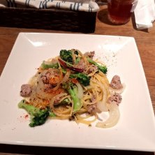 とれたて市場風スパゲティ 大きめエビイカ、あさりとネギ。エビイカしっかり、かかってるソースがシーフード感たっぷりの汁でよい感じ。美味しかった(´ρ`)。フリードリンク付き。ごちそうさま。