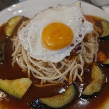 おひるごはん★名古屋めし ピリ辛麻婆茄子あんかけパスタ +OPにオムレツ 麺のボリュームはハーフサイズで充分✌︎('ω'✌︎ )