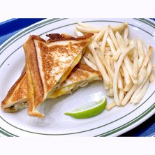 神奈川県を中心に数店舗有るカフェの店、ロンカフェの3種のチーズと豚肉のキューバサンド。チェダー、モッツァレラ、レッドチェダーの3種類のチーズ、ハーブが香るジューシーな豚肉、こんがり焼いたベーコンとピクルスを挟み、両面をサクッと焼き上げて作られたホットサンドイッチで、ポテトとライムが添えられている。ホットサンドイッチの中では1番人気メニューであるが、本店である湘南江の島店では販売されていない。ドリンクセットにしたらポテトを増量して貰えた。量が余り多くない割には高いが、味はまあまあ。